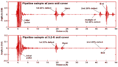 The attenuation is higher with increasing wave frequency and soil depth. Coating and insulation also increases the wave attenuation. It will be higher than a bare or painted pipe. The below data were plotted to show the soil effect on wave propagation. The top plot shows the data of 20- kHz torsional mode from a 4.5-inch-OD bitumen coated pipe without soil cover. The bottom was acquired after a 3.2-ft soil covering. The attenuation was significantly increased due to guided-wave energy leakage to the soil.